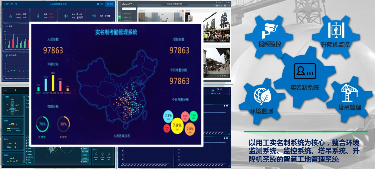 智慧工地管理系統(tǒng)以用工實名制為核心,利用新型物聯(lián)網(wǎng)和云計算技術(shù),將建筑項目施工現(xiàn)場的真實運(yùn)作數(shù)據(jù)進(jìn)行采集和匯總處理,以可視化的形式在平臺上進(jìn)行實時展現(xiàn)。